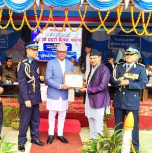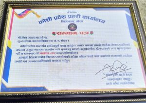 गोठगाउँ (मोरङ)। ६९ औं प्रहरी दिवसको अवसरमा नेपाल प्रहरीलाई अपराध अनुशन्धानमा पुर्याएको योगदानको उच्च मुल्याङकन गर्दै सुन्दरहरैंचा अपडेटका प्रवन्ध निर्देशक शिव भट्टराई भोजपुरे सम्मानित हुनु भएको छ । विराटनगरमा आयोेजित एक कार्यक्रममामा कोशी प्रदेशका मुख्यमन्त्री हिक्मतकुमार कार्कीले सञ्चारकर्मी भट्टराईलाइ कदरपत्रसहित सम्मान गर्नु भएको हो । आफूलाई सम्मान गरेकोमा कोशी प्रदेश प्रहरी कार्यालयलाई सञ्चारकर्मी भट्टराईले धन्यवाद दिनु भएको छ । यस सम्मानले आगामी दिनमा पनि समाजको लागि उर्जाशील भएर काम गर्ने हौसला मिलेको भट्टराईले जनाउनु भएको छ । भट्टराई भन्नुहुन्छ, “प्रहरी कार्यालयले सुरक्षासम्बन्धी क्षेत्रमा गरेको योगदानको कदर गर्दै आफूलाई गरेको सम्मानले अझ समाजमा सत्यको प्रचार र अनुसन्धानात्मक पत्रकारितालाई प्रोत्साहन दिएको छ।”
